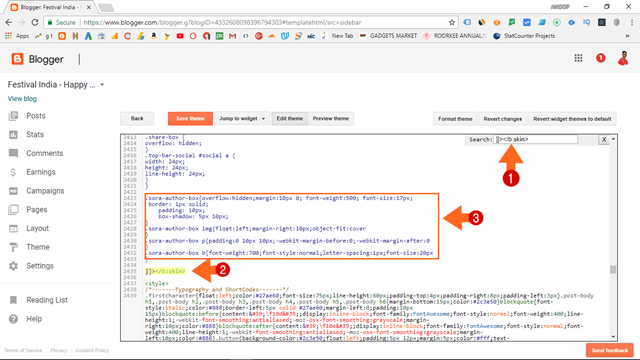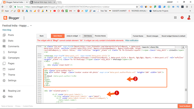 - यदि आप हमारे Author Box को देखें तो Author Box से पहले Share This का Wedget है और इस पर Share This लिखा है तो यदि Template में Share This Search करते है तो हमें Share Wedget की Coding Show होगी या आप Author Box के बाद देख सकते है की वहाँ पर Related Post का Wedget है तो आपको अपने Template पर जहाँ पर भी Author Box Add करना है वहां पर आपको पहले या उसके बाद जो wedget है उसमे किसी Text को आपको Template पर Search करना है.