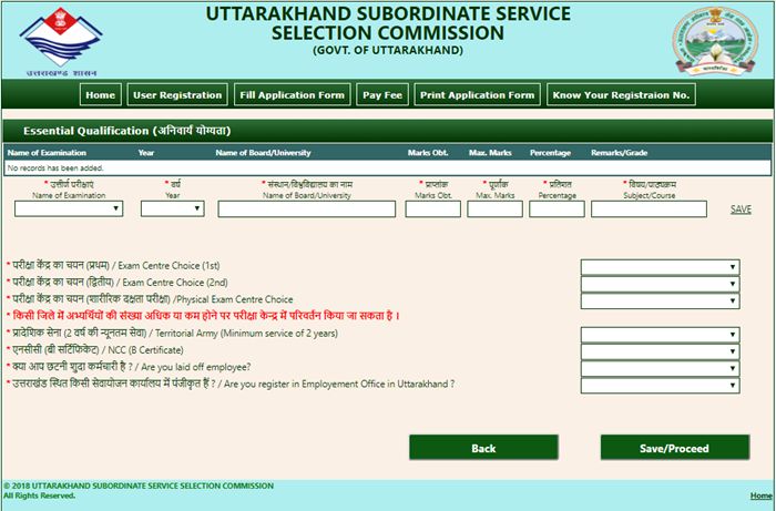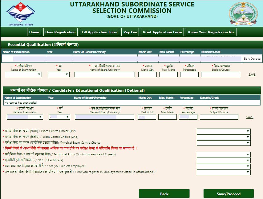- अब आपका Form Open हो जायेगा आपको यहाँ पर कुछ जानकारी Fill करनी है जैंसे Mothers name, Category, Sub-Category, Gender, Nationality, वैवाहिक स्तिथि Resident of uttarakhand, Aadhar Number और इसके बाद Save/ Proceed पर Click कर दें.